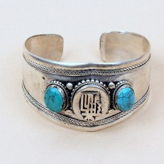 Массивный, но при этом легкий браслет из белого металла (на руке не темнеет) с изображением мантры Калачакры (ОМ ХАЧА МАЛА ВАРА ЯНГ СОХА), которая уравновешивает энергии всех пяти элементов и защищает от всего неблагоприятного. Также браслет украшен двумя вставками из натуральной бюрюзы.