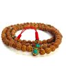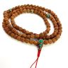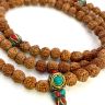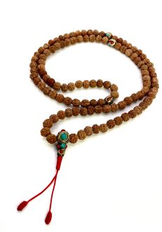 Буддийские четки с бусинами из семян дерева рудракши. В четках 108 бусин, диаметр бусины 7-9 мм. Разделители и гуру-бусина в тибетском стиле с инкрустацией цветной эмалью. Четки собраны на прочный нейлоновый шнур алого цвета, который завершается скользящим узлом Махакалы, позволяющий регулировать натяжение и длину четок. Длина четок — 88 см.