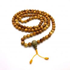 Буддийские четки с бусинами из золотого сандала, очень красивого теплого оттенка. На бусинах отчетливо видны древесные узоры. Четки собран в соответствии с буддийской традицией. В четках 108 бусин, диаметр бусины 8 мм. Гуру-бусина выполнена из зеленого сандала. Четки нанизаны на прочный нейлоновый шнур, который завершается узлами Махакалы — главного защитника буддизма.