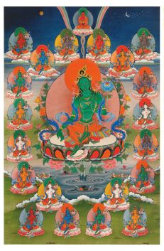 На этой печатной тханке изображен традиционный буддийский сюжет: 21 форма Тары. Качественная печать на холсте, роспись по контурам золотой краской.
