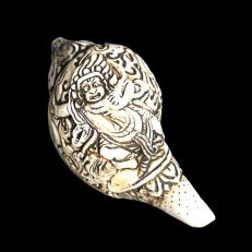 На этой белой морской раковине вырезано рельефное изображение Ваджрапани, одного из главных гневных охранителей буддизма.