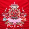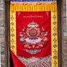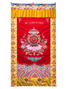 Традиционная тибетская дверная занавеска с ламбрекенами, украшенная изображением восьми благоприятных символов буддизма. На занавеске вышито тибетское благословение Таши Дэлек.