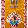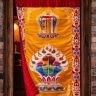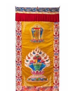 Традиционная тибетская дверная занавеска с ламбрекенами, украшенная изображениями мантры Калачакры и Чинтамани — драгоценности, исполняющей желания.