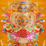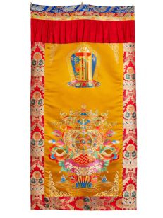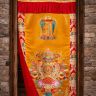 Традиционная тибетская дверная занавеска с ламбрекенами, украшенная изображениями мантры Калачакры и Восьми благоприятных символов буддизма.