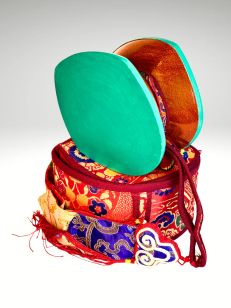 Маленький ромбовидный барабан дамару используется во многих ритуалах буддизма, часто в сопровождении колокольчика.